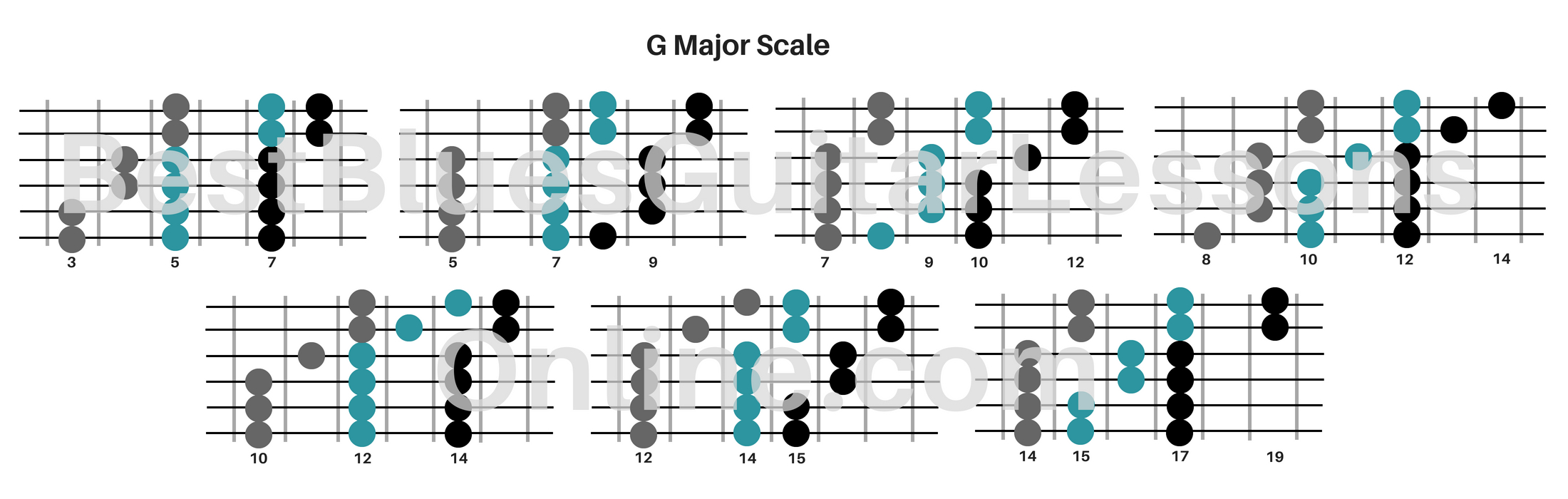 The patterns above are a representation of the G major scale. The real benefit of these scale patterns are the three notes on EVERY string. This allows you to use directional picking while performing all notes from the scale.