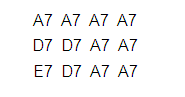 To illustrate how chords and scales are very deeply intertwined, we start from a standard 12 bar blues progression in the key of A, with the following chords: