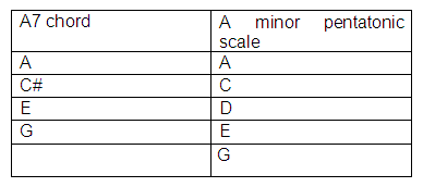 As you see in the table above, the C# note in the A7 chord clashes with the C note of the A minor pentatonic scale. Try this out for yourself on your guitar, play a C note and play a C# note an octave higher; not the best sound in the world right?