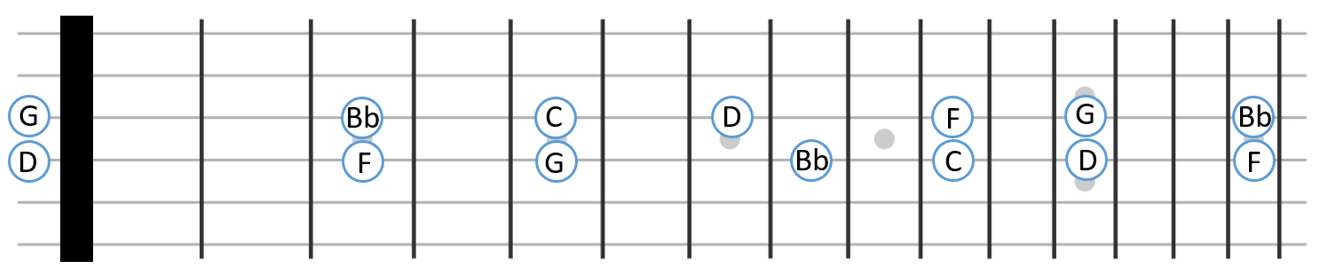 As I mentioned before it’s vital to know your scales on one string for this technique. On the fretboard image below I visualised the G minor pentatonic scale on the G and D string.