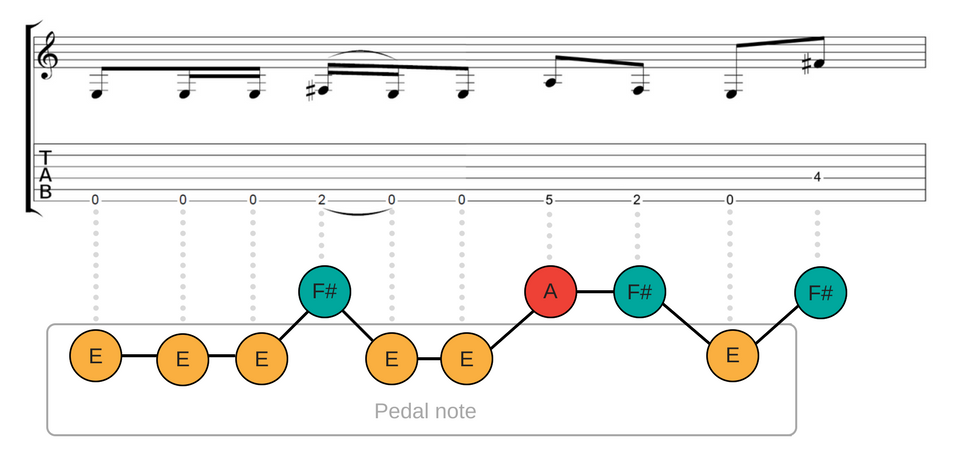 A pedal point is a technique where different notes are played around one stationary note. This stationary note is referred as the pedal note or also called the pedal tone. In guitar playing, this pedal note is often an open string. To give you an overall idea of how this technique sounds, have a look at the example below.
