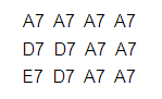 The first chord at the left side is the A7 chord. Under the A7 chord you’ll see the D7 chord and under the D7 you’ll get the E7 chord.
