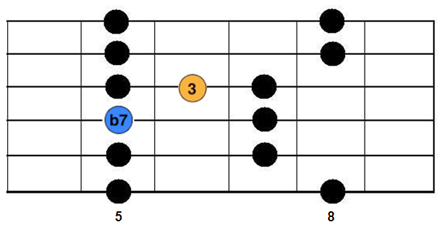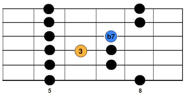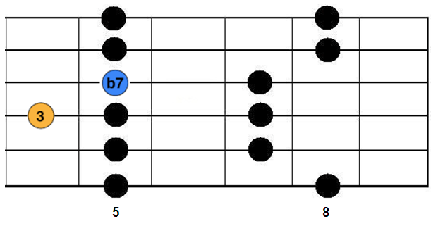 As you see in the next diagram, here we use the minor pentatonic box position again as our main starting point, but add the two important notes from the D7 chord.