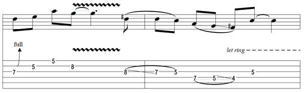 Let’s look at some real-life examples of how this chord tone targetting gets used. Below you find an example lick that would fit neatly over the D7 chord.